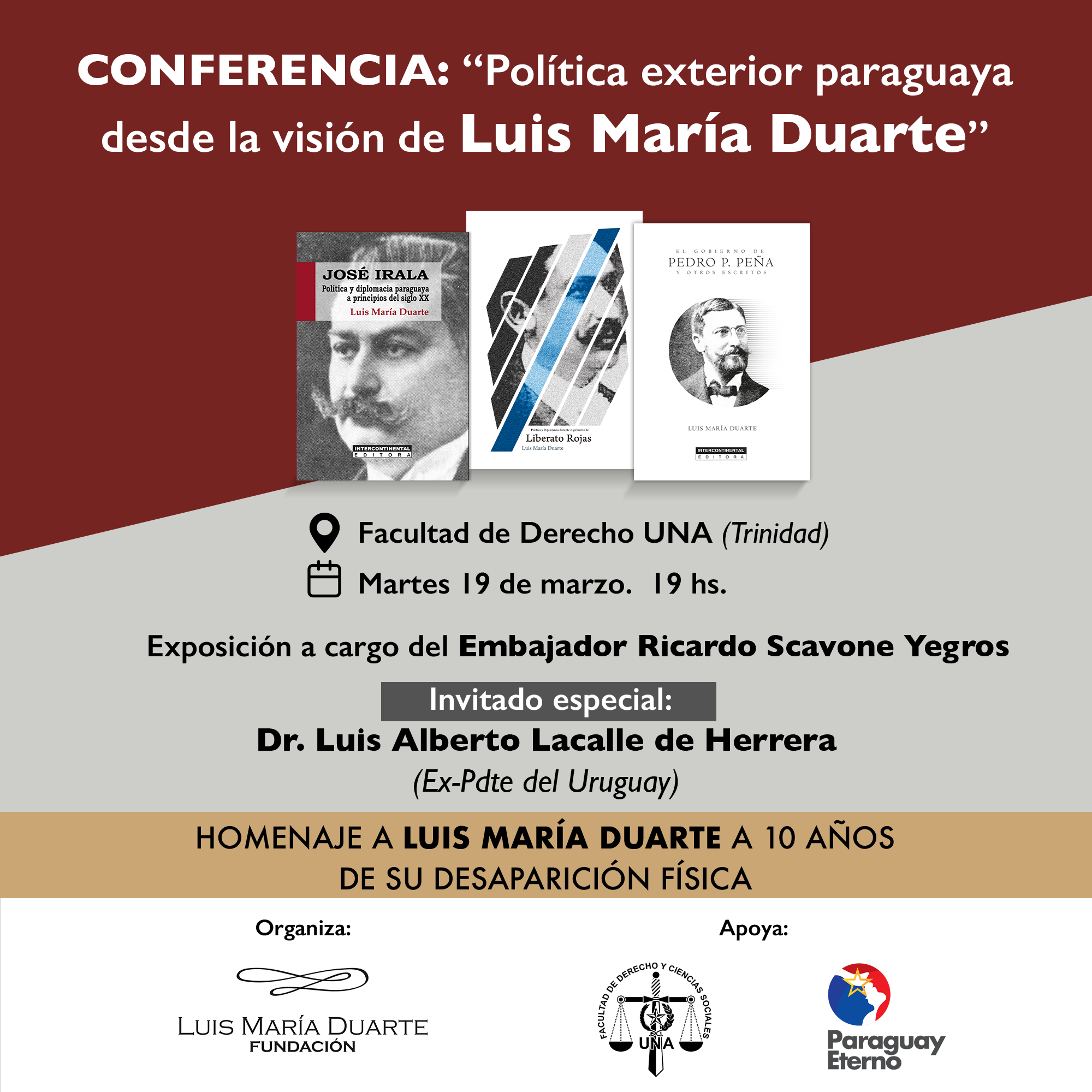 El próximo 14 de marzo de 2019 se llevará a cabo el lanzamiento del tercer libro de Luis María Duarte, al cumplirse cinco años de su fallecimiento: El Gobierno de Pedro P. Peña y otros escritos. El mismo tendrá lugar en la sede del Ministerio de Relaciones Exteriores, a partir de las 19:00 horas.